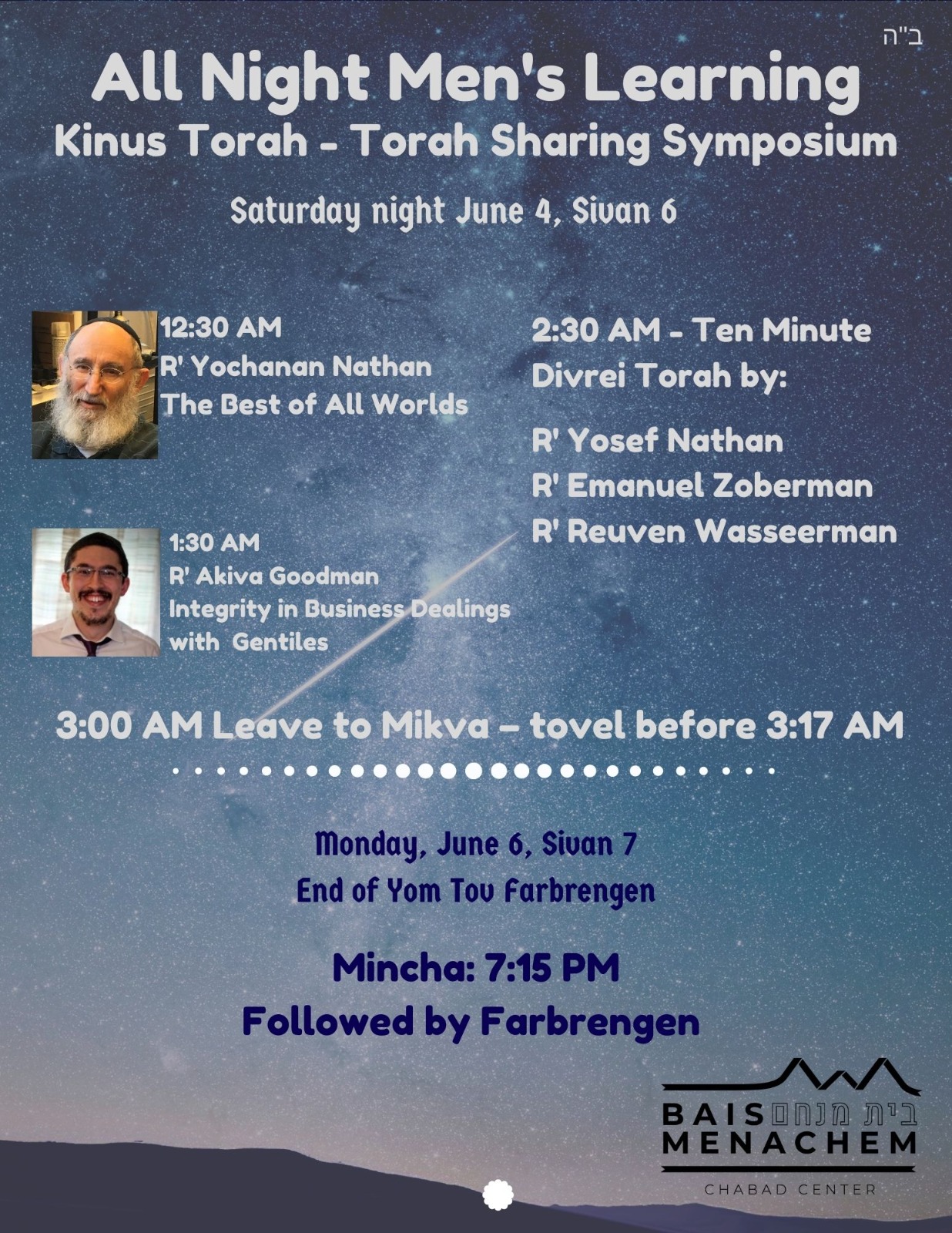 Join All Night Torah Learning at Bais Menachem Chabad Center